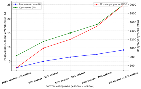Рисунок 3. Показатели прочности и упругости нитей, изготовленных из смеси хлопковых и полиамидных волокон в различных соотношениях