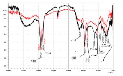 Спектры передавались с одинаковой интенсивностью и с одинаковой скоростью сканирования от 500 до 4000 см-1 (рис.1). Описаны ИК-спектры битума без изменения состава (красным цветом) и ИК-спектры битума марки ПФГ-РМ (черным цветом).