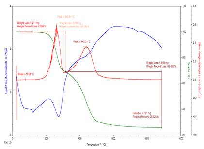 Результаты дифференциально-термического (ДТ) анализа битумов марки ПФГ-РМ выявили три стадии потери массы, один экзотермический и один эндотермический процесс. На первом этапе при температуре 77,08 °С отмечается потеря массы 0,011 мг или 0,099 %, что объясняется выделением связанной воды в кристаллогидрате. На втором этапе при температуре 260,81 °C наблюдалась потеря массы 3,286 мг или 30,726 %. В этом диапазоне происходит высвобождение оксида углерода (II) в результате распада карбоксильных групп. Третья стадия, основная стадия разложения, начинается при 440,31 °C и продолжается до 877,7 °C с потерей массы 4,648 мг или 43,458%. В этом процессе происходит разложение органических соединений с образованием оксидов из аминогрупп азота и оксидов металлов из карбонатов металлов. DT-анализ синтезированного продукта показал, что при температуре 802,34 °C во время эндотермического процесса остается 2,751 мг или 25,725 % остаточного вещества. На этом этапе было показано, что оставшиеся остатки представляют собой соли металлов.