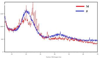Рисунок 8. Рентгенофазный анализ составов немодифицированных битумов (B) и битумов марки ПФГ-РМ (M)