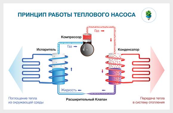 Результаты и обсуждение: Принцип работы теплового насоса. Принцип работы и конструкция тепллонасосной установки идентичны бытовому холодильнику и кондиционеру, в этих устройствах различны лишь их цели применения. Холодильники и кондиционеры используются для охлаждения, а теплонасосные установки – для нагрева.