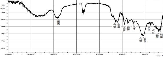 Результаты анализа ИК-спектра. ИК-спектр немодифицированного битума. В области 2902,87 см-1 расположены группы, возникающие за счет асимметричных и симметричных валентных колебаний метильных (-СН3), метиленовых (-СН2) групп. Колебание сульфосвязи группы S-S можно наблюдать в области 1039,63 см-1. Связи между -C=C- наблюдались в области 1653 см-1, а валентные колебания -C-S-C- наблюдались в области 1064,71 см-1 (рис. 1).
