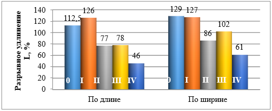 Разрывное удлинение образцов по длине меняется в пределах 46-126%. Уменьшение показателей разрывного удлинения по длине наблюдается в вариантах II, III, IV их следует рекомендовать как переплетения с уменьшенным разрывным удлинением, следовательно, малорастяжимый трикотаж с улучшенной формоустойчивостью по длине (рис. 3).