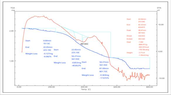 - Organic structural parts up to 561°C disappear, in which case the main weight loss (40.85%) in the second stage will happen.