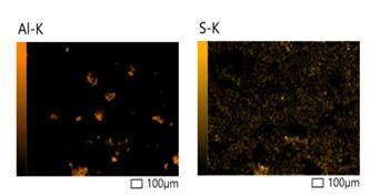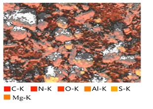 Microscope analysis was performed using an INCA energy detector with a resolution of 1 nm for the analysis of beryllium-based phthalocyanines. Scanning electron microscopy analysis was performed under high vacuum. The same setup was used to perform a microanalysis of the outer pigment coating while studying the accelerating field at 20 keV and 1 nA current. The results show that no traces of the reacted product are visible in the 200x, 700x, and 1000x magnification images of the aluminium-magnesium phthalocyanine pigment sample. This allows us to establish the completion of the reaction and, at the same time, obtain information about the elemental composition of the substance undergoing the reaction. Studies show that the particle size of the aluminium-magnesium phthalocyanine pigment ranges from 28.71 to ~ 35.72 nm. In this case, cluster analysis was performed for each surface element. Analysis: C-K (Carbon): This is the main structural element of aluminium phthalocyanine, which is the basic building block of organic molecules. N-K (Nitrogen): Nitrogen participates in the basic structures of fluorine as a bonding and main functional group. O-K (Oxygen): This is not often, but this oxygen is formed as a result of oxidation of molecules or other compounds. Al-K (Aluminium): This is the central part of aluminium-magnesium phthalocyanine. Mg-K (Magnesium); magnesium is bound to the central part. K-S- (Sulphur) can be an additional or functional group. The data obtained confirm all the expected compositions of aluminium-magnesium phthalocyanine, which is indicated by the presence of homogeneously distributed elements, i.e., micro clades or phases can be present.