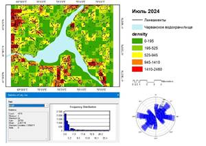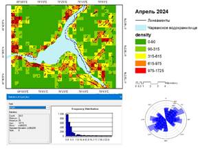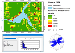 Заключение. Результаты сезонного анализа линеаментных структур показали, что их минимальное количество наблюдается в зимний период (январь). По мере наполнения водохранилища в апреле количество линеаментов увеличивается, достигая максимального значения в июле, что, возможно, связано со спуском воды. С октября начинается постепенное снижение их числа. Кроме того, анализ роза-диаграмм выявил, что основное направление линеаментов во все месяцы остается неизменным — с северо-запада на восток, что, вероятно, обусловлено направлением течения воды.