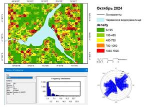 Карта плотности линеаментов Чарвакского водохранилища показывает повышенную плотность в северо-западной и юго-восточной частях территории в летний и осенний период (рис.3 (в, с)).