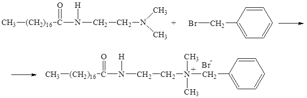 Third Stage: Reaction with Benzyl Bromide In the third stage, the obtained N,N-dimethyl stearamide was reacted with benzyl bromide. In this reaction, the bromine atom in the benzyl group acts as a leaving group, while the free electron pair on the nitrogen atom participates in a nucleophilic substitution reaction, leading to the formation of the final product.