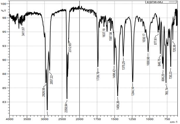 The spectra showed absorption regions at 720.36-730.4 cm⁻¹, corresponding to the CH₂ δ_asym bending vibrations of the sp³ hybridized saturated alkyl group present in stearic acid. The absorption at 806.25-846.75 cm⁻¹ corresponds to the benzene ring in the benzyl molecule, while the peak at 1000.98 cm⁻¹ represents the δ Car-H aromatic ring and hydrogen-bonded vibrations in a long-chain structure. Weakly active CH₂ groups appear in the range of 1244.10-13751.23 cm⁻¹. The absorption at 1400.82 cm⁻¹ corresponds to the νC-N stretching of the N,N-dimethylethylenediamine derivatives bonded with ethyl stearate. The peaks at 1456.26 cm⁻¹ (δ C-H) and 1496.42 cm⁻¹ (ν benzene group) confirm the presence of aromatic structures. The absorption at 1597.04 cm⁻¹ corresponds to δN-H bending vibrations of the secondary amide group, while the peak at 1637.19-1739.79 cm⁻¹ is attributed to the νC=O stretching of the carbonyl group.