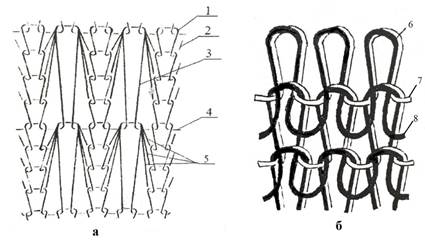 Результаты исследований. С целью расширения ассортимента трикотажных полотен и повышение формоустойчивости трикотажа, разработаны структуры и способа выработки 3 вариантов двухслойного плюшевого трикотажа, которые отличались друг от друга структурой. Известно, что плюшевый трикотаж, выработанный на базе глади, несмотря на свои преимущества, обладает способностью деформироваться при воздействии нагрузок. Это происходит вследствие того, что грунт плюшевого трикотажа имеет менее формоустойчивую структуру по сравнению с тканым плюшем. В результате этого ограничивается область применения трикотажа плюшевого переплетения. Этот недостаток можно устранить путем выработки двухслойного трикотажа где один слой состоит из трикотажа плюшевого переплетения, а другой слой из формоустойчивого трикотажа уточных, футерованных и прессовых переплетения. В I-варианте двухслойного плюшевого трикотажа изнаночный слой образован плюшевым переплетением, а лицевой – тройным прессовым переплетением. Структура слоев I-варианта двухслойного плюшевого трикотажа показана на рис.1. Лицевая сторона I-варианта двухслойного плюшевого трикотажа состоит из петель 1 обычной величины, образованных из нитей 2, удлиненных петель 3, образованных из нитей 4 и набросков 5 (рис.1, а). Изнаночная сторона двухслойного плюшевого трикотажа состоит из плюшевых петель 6 образованных из грунтовой нити 7 и плюшевой нити 8. (рис. 1, б). Петли 1 лицевого слоя соединены с петлями 6 изнаночного слоя этого же ряда с помощью соединительной нити (рис. 1).