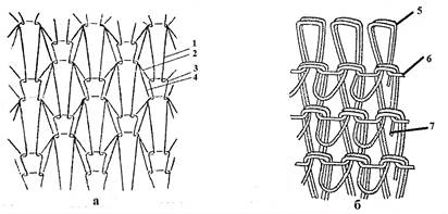 С целью расширения ассортимента трикотажных полотен улучшения качества и повышения формоустойчивости трикотажа разработана структура и способ получения II-варианта двухслойного плюшевого трикотажа, где лицевой слой выработан двойным прессовым переплетением, а изнаночный – плюшевым переплетением. Структура слоев II-варианта двухслойного плюшевого трикотажа показана на рис. 2. Лицевая сторона II-варианта двухслойного плюшевого трикотажа состоит из удлиненных петель 1, набросок 2, из петель обычной величины 3 и второй набросок 4 (рис. 2, а). Изнаночная сторона состоит из плюшевых петель 5 образованных из грунтовой нити 6 и плюшевой нити 7 (рис 2,б) . Петли 1 лицевого слоя соединены с петлями 5 изнаночного слоя с помощью соединительной нити (рис. 2).