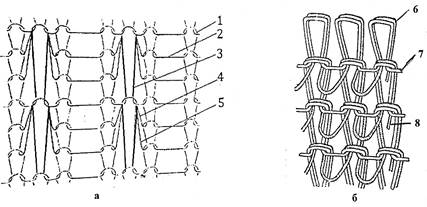 Лицевая сторона III-варианта двухслойного плюшевого трикотажа состоит из петель обычной величины 1, удлиненных протяжек 2, удлиненных петель 3, набросок 4 и второй набросок 5 (рис. 3, а). Изнаночная сторона состоит из плюшевых петель 6 образованных из грунтовой нити 7 и плюшевой нити 8 (рис. 3, б). Петля І лицевая слоя соединены с петлями 6 изнаночного слоя с помощью соединительной нити 9 (рис. 3.). Третий вариант двухслойного плюшевого трикотажа на плоскофанговой машине получается следующем образом (рис. 3).