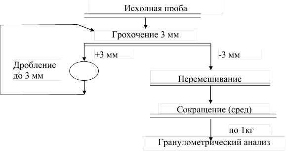 Основной особенностью подготовки лабораторных проб является соблюдение мер по сохранению их гранулометрического состава. По этой причине грохочению и опробованию пробы не подлежат. Для ориентировочного контроля качества проб по содержанию основного компонента допускается горстевой отбор по сетке мелкого материала крупностью -5 мм общей массой 2,5 кг для неравномерных или 5 кг для весьма неравномерных руд. Результаты анализа с учетом эффекта избирательного измельчения рудных минералов дают ориентировочные сведения о качестве пробы.