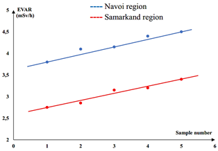 As seen from Table 1, in the samples from the Navoi region, the average equivalent dose rate of external gamma radiation is 0.246 mSv/h, the average equivalent volumetric equilibrium dose rate of radon is 4.19 mSv/h, the average dose rate of long-lived alpha nuclides is 0.245 mSv/h, and the average effective dose rate in drinking water is 0.154 Bq/l.