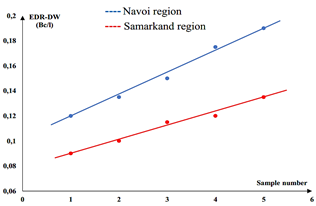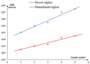 The dose rates detected in the territories of the Navoi and Samarkand regions are presented and compared in graphical form in Figures 1, 2, 3, and 4 below.
