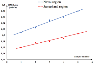 According to the results of the conducted studies, the average total values of these factors (EDR + EVAR + EDR_LLA + EDR_DW) were 4.835 mSv/h in the Navoi region and 3.544 mSv/h in the Samarkand region. These values comply with the established standards and do not exceed the limits specified in SanPiN-0193-06 [11, 12].