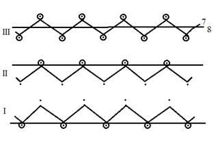 В этой системе с помощью дополнительного нитеводителя между иглами задней и передней игольниц, сверху соединительной нити прокладывают уточную нить (рис. 2, III ряд раппорта переплетения).