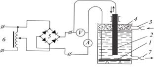 Лабораторный стенд для исследований по электрофлотации в основном состоит из следующего: стеклянной емкости с цилиндрическими электродами (5-катод, 2-анод) емкостью 5 л. в качестве рабочей камеры, источника постоянного тока 5, лабораторного автотрансформатора 6, входящего 3 и выходящего 7 продуктов переработки сока, состоящего из отпарных котлов и отделенной пены 4 и измерительно-регулирующего устройства.