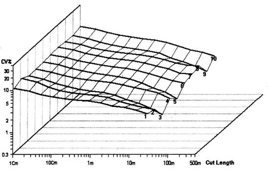 Результаты. Анализ полученных результатов (Таблица 2) показывает, что коэффициент вариации по линейной плотности пряжи составил 1,7 % в экспериментальном варианте. Этот показатель также можно увидеть на графике вариации по длине (VU CURVES 3D рис. 1).