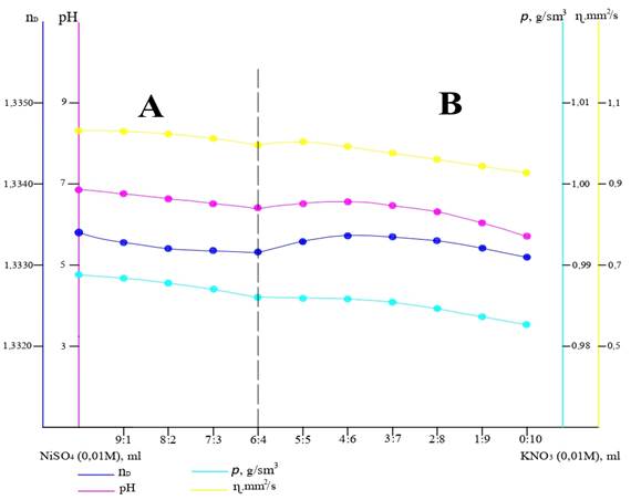 Для теоретического обоснования взаимодействия сульфата никеля и нитрата калия проведен анализ физико-химических свойств разбавленных растворов методом изомолярных серий путем измерения значений рН, плотности, показателя преломления и вязкости смеси 0,01 М растворов в зависимости от соотношения компонентов в системе [NiSO4 (0,01 М)]:[KNO3 (0,01 М)].