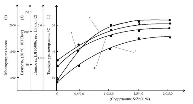 Рисунок 1. Зависимость содержание серы оксида цинка на температуру замерзание (1), липкость (2), вязкость (3), молекулярная масса пиролизной смолы. (Температура 120оС, время 20 мин.)