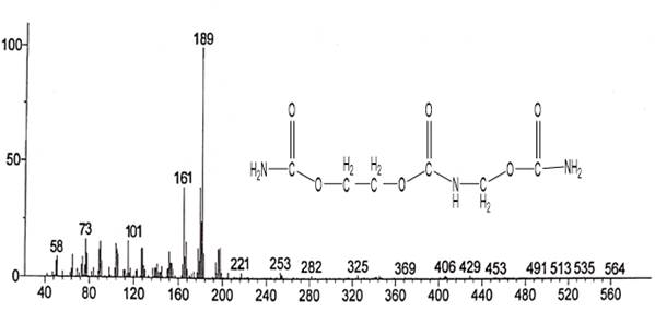 Ключевые слова: ЭГМФ (система этиленгликоль–мочевина–формальдегид), термостойкое покрытие, хромато-масс-спектрометрия (Х–МС), фрагментные ионы, этиленгликоль, мочевина, формальдегид.