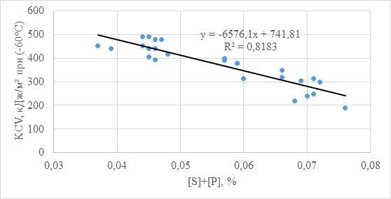 Рисунок 2. Зависимость влияния суммарного содержания вредных примесей на ударную вязкость стали (фактические данные)