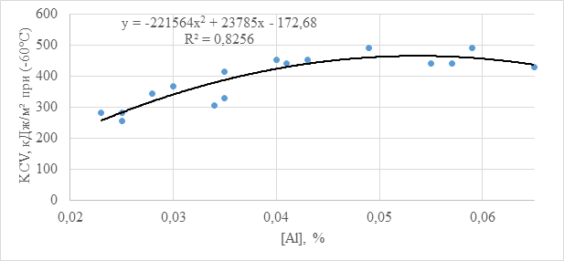 Рисунок 3. Зависимость влияния алюминия на ударную вязкость стали (фактические данные)