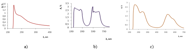 Figure 1 shows that Figure 1.c differs significantly from the additive sum of Figures 1.a and 1.b. There is a sharp increase in optical density at a wavelength of 290-370 nm, which corresponds to the visible region of the spectrum and a large increase in the range of 590-700 nm, i.e. in the ultraviolet part of the spectrum. This indicates that a chemical interaction occurs between the dye and chitosan in solution under these conditions.