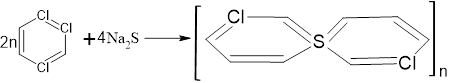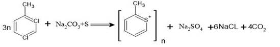 Результаты проведенной реакции показывают, что теоретически и практически на первой стадии образуются сульфиды щелочных металлов, и только после этого галогенпроизводные бензолов и сульфиды щелочных металлов подвергаются поликонденсации с образованием ПФС. Схему реакции можно представить в следующем общем виде на примере смеси 2,4-дихлортолуола и серы с карбонатом натрия: