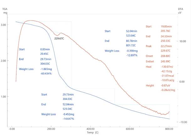 Для полифенилсульфида (ПФС) была выбрана максимальная температура 800°C, и результаты анализа ПФС были изучены на основе дифференциальной термогравиметрической (ДТА) и термогравиметрической (ТГА) дериватограмм. При температуре 229,67°C наблюдался один эндотермический пик, представляющий собой вершину на кривой термического анализа, характеризующую процесс поглощения тепла.
