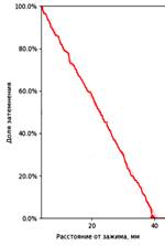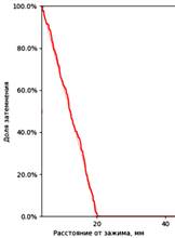 На начальном этапе исследований была проверена справедливость заключения, что при сканировании бородки волокон в зажиме в виде слое, отличного по толщине от слоя из единичных волокон, часть волокон не участвует в «изменении» степени затемнения светового потока. Это осуществили на основе построения фиброграмм, вид которых для волокон равной длины, согласно [9], должен быть в виде, указанном на рисунке 1. Результаты анализа полученных данных представлены на рисунке 2.
