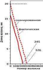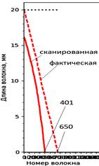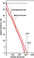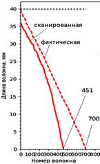 Из анализа графических зависимостей следует, что вид фиброграммы в виде прямой формируется только при малом количестве волокон в зажиме. Это наблюдается для волокон с исходной длиной 20 и 40 мм. При увеличении числа волокон в зажиме линия фиброграммы имеет искривления.Из этого следует вывод, что при расположении в зажиме волокон в виде бородки с толщиной слоя более толщины из единичных волокон, положения известных теоретических основ построения фиброграммы [10] не применимы. Вероятно, это связано с тем, что разработка теории проводилась при допущении, что волокна в зажиме расположены в виде одного ряда. Однако при большем количестве рядов волокон возникают условия, когда часть волокон не участвует в «затемнении» светового потока при сканировании.