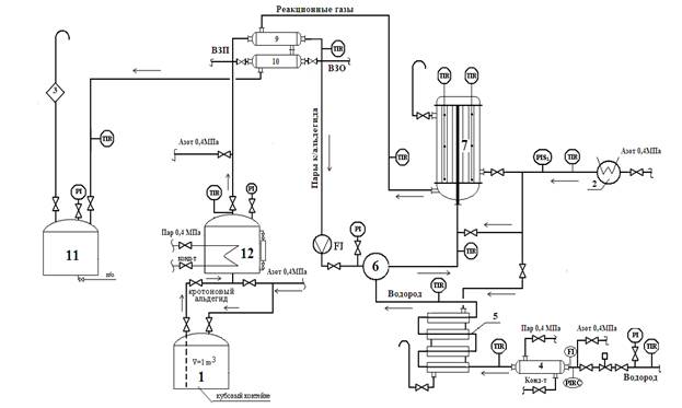 1-кубовый контейнер кротонового альдегида; 2-лектроподогреватель азота; 3-огнепреградитель; 4,5,9,10-теплообменник; 6-смеситель; 7-реактор гидрирования; 11-сборник н-бутилового спирта; 12-испаритель кротонового альдегида.