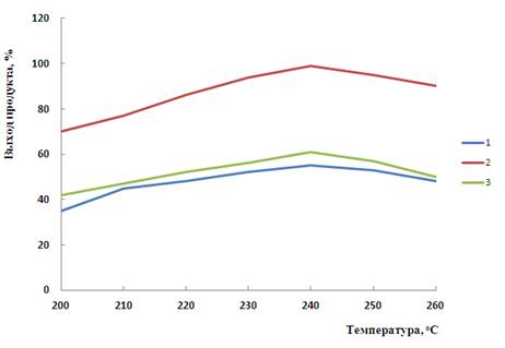 Анализ результатов исследования (рис.2) показывает, что при проведении синтеза в интервале температур 200–240 °С с использованием катализатора CuO на силикагеле марки КСКГ увеличивается выход н-бутанола с 35 до 55 %, конверсия по общему с 70 до 99 % и конверсия по бутанолу с 42 до 61 % соотвественно с повышением температуры. С повышением температуры от 240 оС наблюдается уменшение выхода и конверсия н-бутанола .