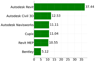 Modern automation technologies are based on the use of software solutions that integrate model parameters with design and construction tasks. Among the most significant tools is Autodesk Revit. According to 2024 data [5], it holds a leading position in the BIM and Architectural Design Software category, with a market share of approximately 37% (fig. 1).
