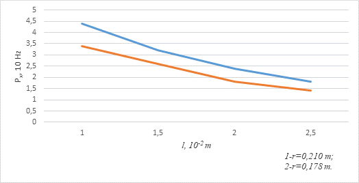 Also, Figure 3 shows a graph of the natural vibration frequency of a cotton piece hung on the serrated teeth of a saw-toothed drum belt as a function of its length. According to the analysis of the constructed graphs, when the length of the cotton piece increases from 14 mm to 24 mm and the drum radius is 0,210 m, the natural vibration frequency decreases from 34,5 Hz to 16 Hz with a fine connection, while when the length of the cotton piece is 24 mm, its natural vibration frequency decreases from 29,2 Hz to 13,15 Hz. In general, if the length of the cotton piece is small, the specific vibration frequency will decrease, that is, the cleaning efficiency will also decrease. To ensure high cleaning efficiency, it is advisable to set the drum radius to (0,21÷0,25) m and the cotton piece length l >20 mm.