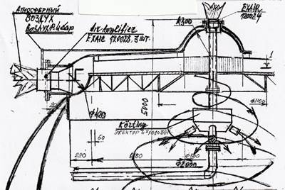 Таким образом, по оси вихря поток охлаждается до нулевых температур и направляется по удлиненному кольцу с низу в верх. В этом объеме градирни холодный воздух встречается с потоком брызг горячей воды, которая подается посредством многоходовым эжектором фирмы «KOЕRTING».