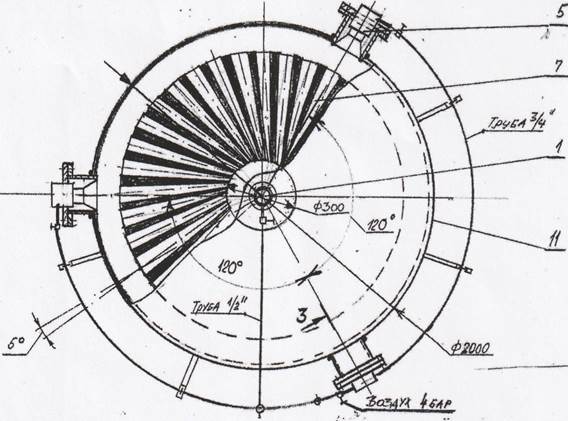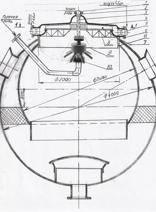 Экспликация. 1. EXAIR, SUPER AIR AMPLIFIERS MODEL120024. 2. Патрубок фланцевый Ду 150. 3. Труба Ду 100. 4. Крышка завихрителя. 5. EXAIR, SUPER AIR AMPLIFIERS, MODEL 120028. 6. Патрубок фланцевый Ду 350. 7. Завихритель. 8. Ферма силовая (м/конструкция). 9. KOERTING, эжектор многоходовой (расчету объема поступающей горячей воды). 10. Труба Ду по расчету объема подачи горячей воды на эжектор). 11. Рабочая емкость градирни.