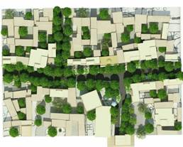 Рисунок 5. Метод озеленения центральных улиц городищ, при продольном восходе и закате солнечных лучей по отношению к улице, с целью обеспечения теневого пространства в течении дня