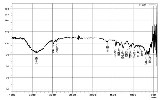 При анализе ИК спектра исходного ПВХ (рис.2) наблюдается, что в спектре поливинилхлорида валентное асимметричное поглощение групп СН2– в полимере соответствует области 2974 см-1, а деформационное поглощение этой группы – области 1425 см-1. Валентное асимметричное поглощение групп СН– в полимере находится в области 2908 см-1, а деформационное поглощение этой группы соответствует диапазонам 1325-1250 см-1. Области поглощения, соответствующие связям –С–С– в длинной цепи макромолекулы, находятся между диапазонам 1092–1051 см-1. Полосы валентного поглощения, принадлежащие C–Cl в поливинилхлориде, соответствуют диапазонам 685–634 см-1.