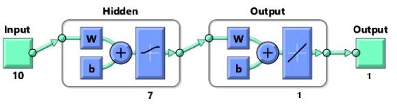 В настоящем исследовании нейронная сеть MLP использовалась для прогнозирования температуры. Чтобы найти наилучшую архитектуру, а более конкретно количество узлов в скрытом слое, модель была обучена и протестирована в течение соответствующих периодов. После выполнения процедуры для разного количества узлов каждый раз (от 1 до 20) и на основе статистических показателей MAE, RMSE, R2 и максимальной ошибки было обнаружено, что наилучшая структура нейронная сеть - 10-7-1, которая дала наиболее достоверные результаты за период тестирования. Структура модели, извлеченная из MATLAB, представлена на рисунке 1, тогда как значения вышеупомянутых показателей представлены в таблице 2 для температуры. В соответствии со специфической структурой нейронной сети были составлены следующие графики сравнения между наблюдаемыми и прогнозируемыми значениями двух переменных.