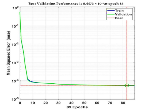 Процесс обучения модели был завершен через 89 этапов (рис. 2), когда среднеквадратичная ошибка проверки (MSE) увеличилась 6 раз подряд. Количество этапов было выбрано равным 83, где ошибка проверки имела минимальное значение, равное приблизительно 5,447 ×10-5. Это значение было получено с помощью нормализованных входных и выходных переменных и отражает наилучшую производительность модели.