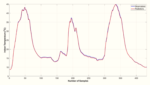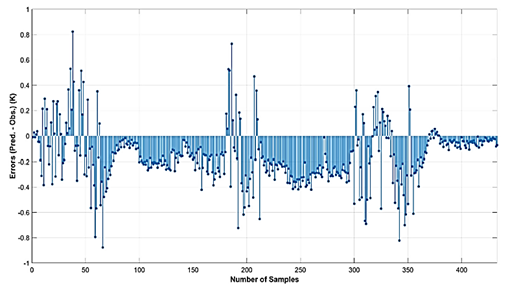 На рисунках 3 и 4 представлены временные ряды прогнозируемых и наблюдаемых значений температуры за 3 дня, использованные для тестирования модели, а также ошибки между соответствующие значения. Как показано на рис. 3, модель в значительной степени предсказала температуру, и наибольшие ошибки возникают в дневные часы, когда температура имеет высокие значения, но также и резкие изменения (рис. 4). Эти ошибки потенциально можно уменьшить, добавив больше выборок перед обучением модели.