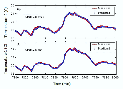 На рисунке 6 показаны результаты моделирования: среднеквадратическая ошибка между измеренными и прогнозируемыми значениями температуры составила 0,008 и 0,0295 для температуры на 5 и 10 минут вперед соответственно.