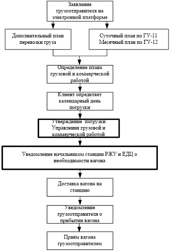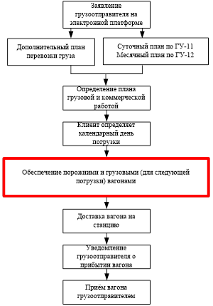 Сегодня учитывая услуги предоставляемые клиентам при перевозке грузов, необходимо учитывать обеспечение порожними вагонами для погрузки грузов и своевременной доставки грузов. Для внедрения электронного обеспечения анализ выполняемых работ приведён в виде блок-схемы (рис. 2).