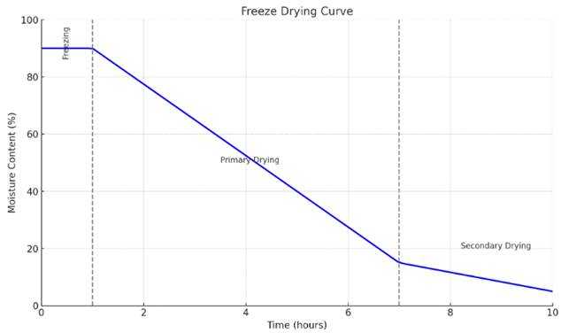 During the freezing stage (0-1 hour), the material is cooled to -40 °C with little change in moisture content, which remains at 90 per cent. This stage is necessary for the moisture to change to a solid state (ice), which is a prerequisite for successful sublimation.