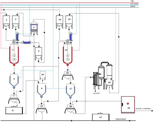 4,6,9,17-ёмкости (Е); 7,11,16,18-нутч-фильтры (Ф); 8,12- контейнеры (К); 3,10,15-мерники (М); 20-сушильный шкаф для сушки (Сш); 2,14-бункеры (Б); 1,13-стеклянные реакторы (Р); 5-холодильник (Х); 19-вакуум-выпарной аппарат (ВА).