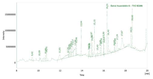 As a conclusion, it can be noted that the identified compounds are elements of group C and H, as well as lower molecular substances, and many of them are compounds with a close structure to terpenoids. 9,12-Octadecadienoic acid (Z, Z)-, methyl ester, Octadecane, 3-ethyl-5-(2-ethylbutyl), Octadecanoic acid, cis-13-Octadecenoic acid 11-Octadecenoic acid, methyl ester, 9,12-Octadecadienoic acid (Z, Z). Substances with effective properties have been identified, such as: antibacterial, anti-ulcerative, anti-ulcer, hypocholesterolemic, cancer prevention, hepatoprotectin, nematicide, antieczemic, 5-alpha reductase inhibitor.