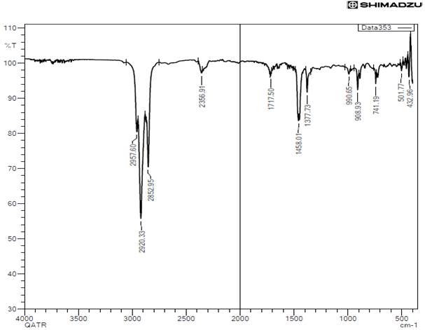 group from naphthenes, demonstrating weak deformation vibrations. Additionally, another signal region is present at 1377.73 cm⁻¹, showing variable intensity attributed to the deformation vibrations of alkanes. The spectrum also indicates the presence of the
